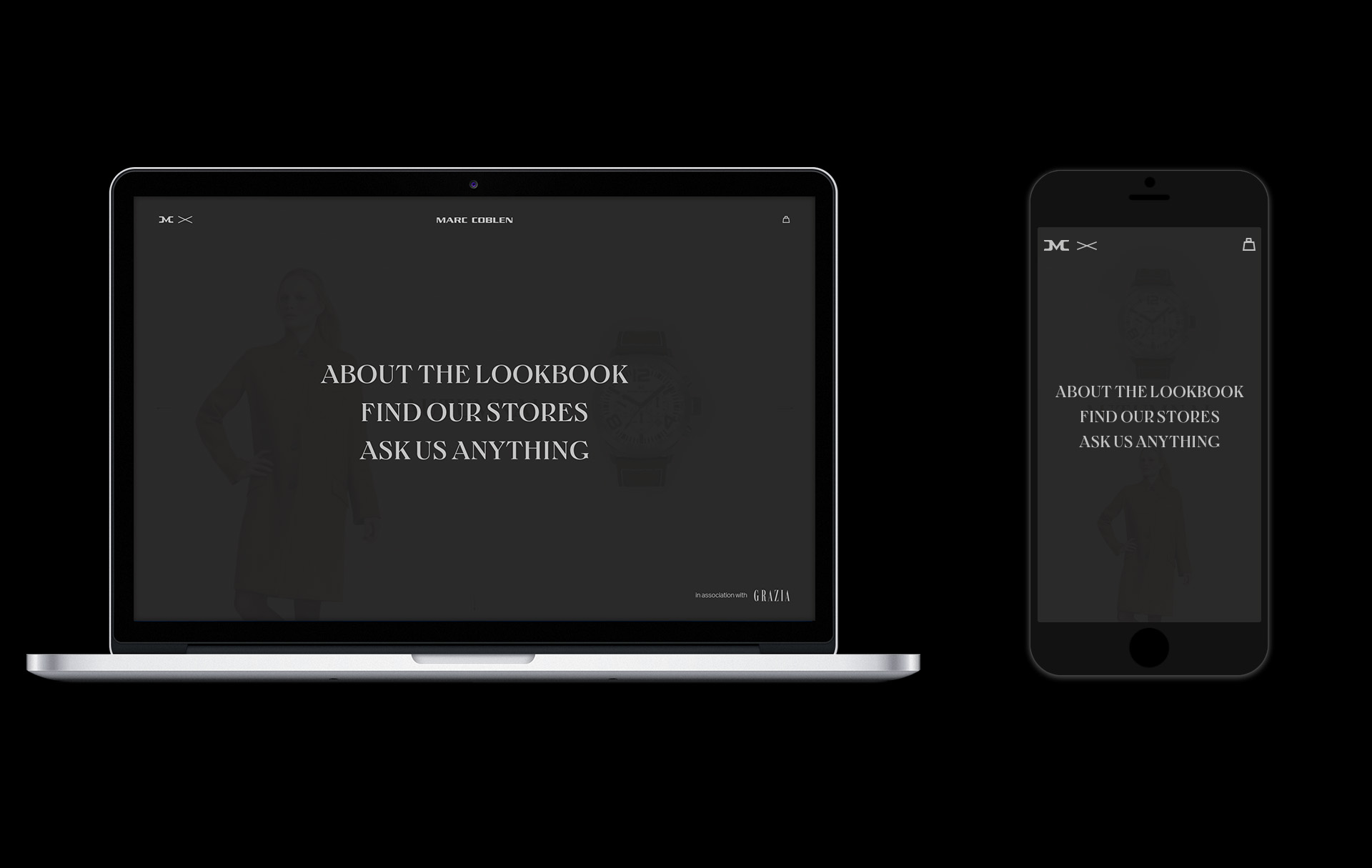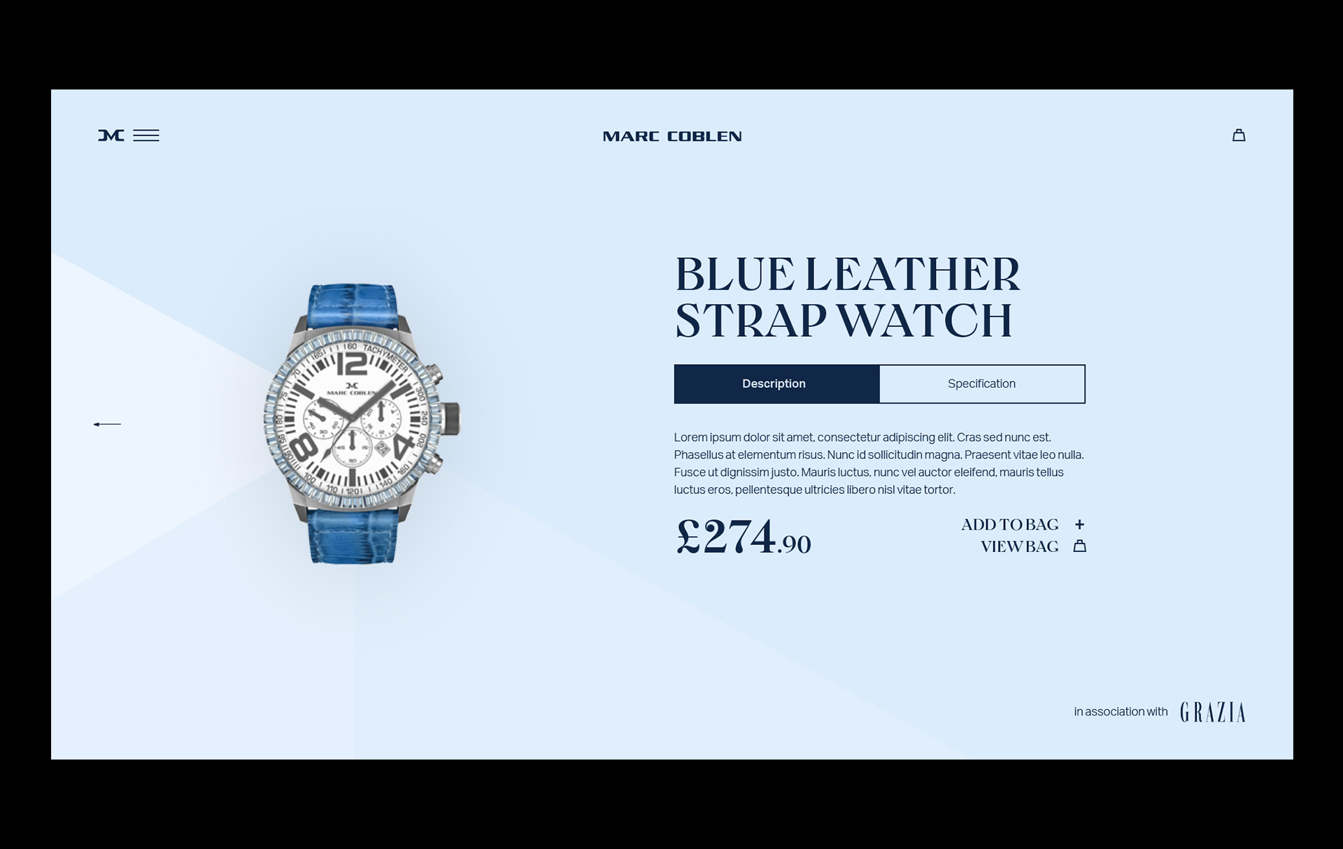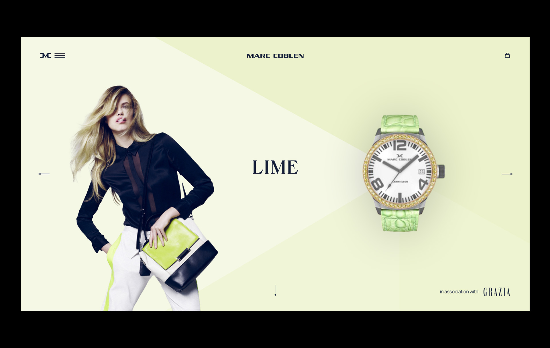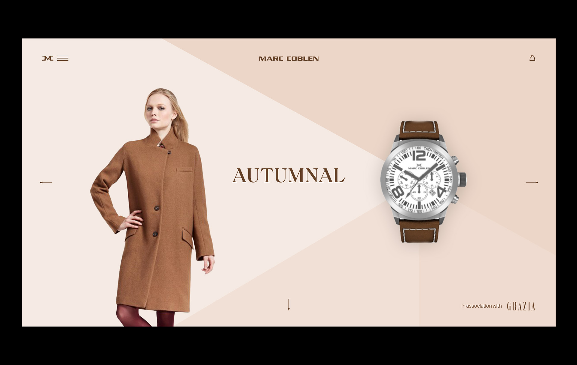 Marc Coblen // During my internship at BMB, I worked on a digital pitch for watchmaker Marc Coblen. We proposed a partnership with Grazia, linking fashion trends to their watches for style-conscious audience. The result was an interactive digital lookbook pairing each trend with a matching watch and outfit. The design system was inspired by the watch’s unique face, divided into thirds instead of quarters.